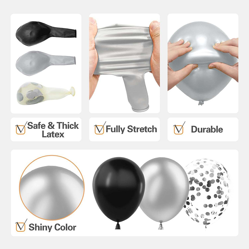 黒とシルバーのパーティーバルーンガーランドキットは、ライトの下でとても素敵に見えます。シルバーのバルーンは光が当たると柔らかなメタリックな輝きを放ちます。黒い部分が見た目のバランスを安定させます。空間に奥行きを感じさせてくれます。冷たい光や暖かい光とよく合います。どちらも異なる外観を作成します。白や青の光の下では、クールでモダンに見えます。暖色系や黄色系の光の下では、柔らかく華やかな雰囲気が漂います。このような視覚的な変化により、黒と銀のバルーン ガーランドはお祭りパーティーに適しています。ビジネス宴会や夜のイベントにも最適です。