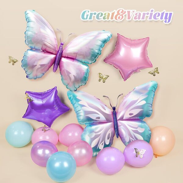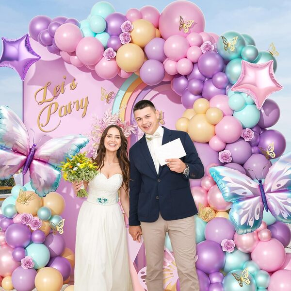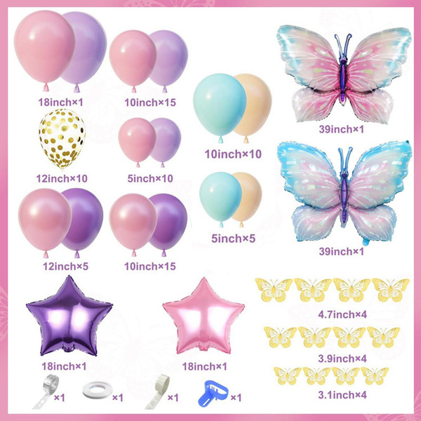 バタフライバルーンアーチキット:アーチキットはカラフルで目を引くもので、さまざまなホイルバルーンとラテックスバルーンで構成されています。アレンジするときは、模様や文字が入った背景ボードを追加し、その周りをバルーンで囲みます。イベントの雰囲気を作る人です。この前で写真を撮るととても綺麗に見えます。
