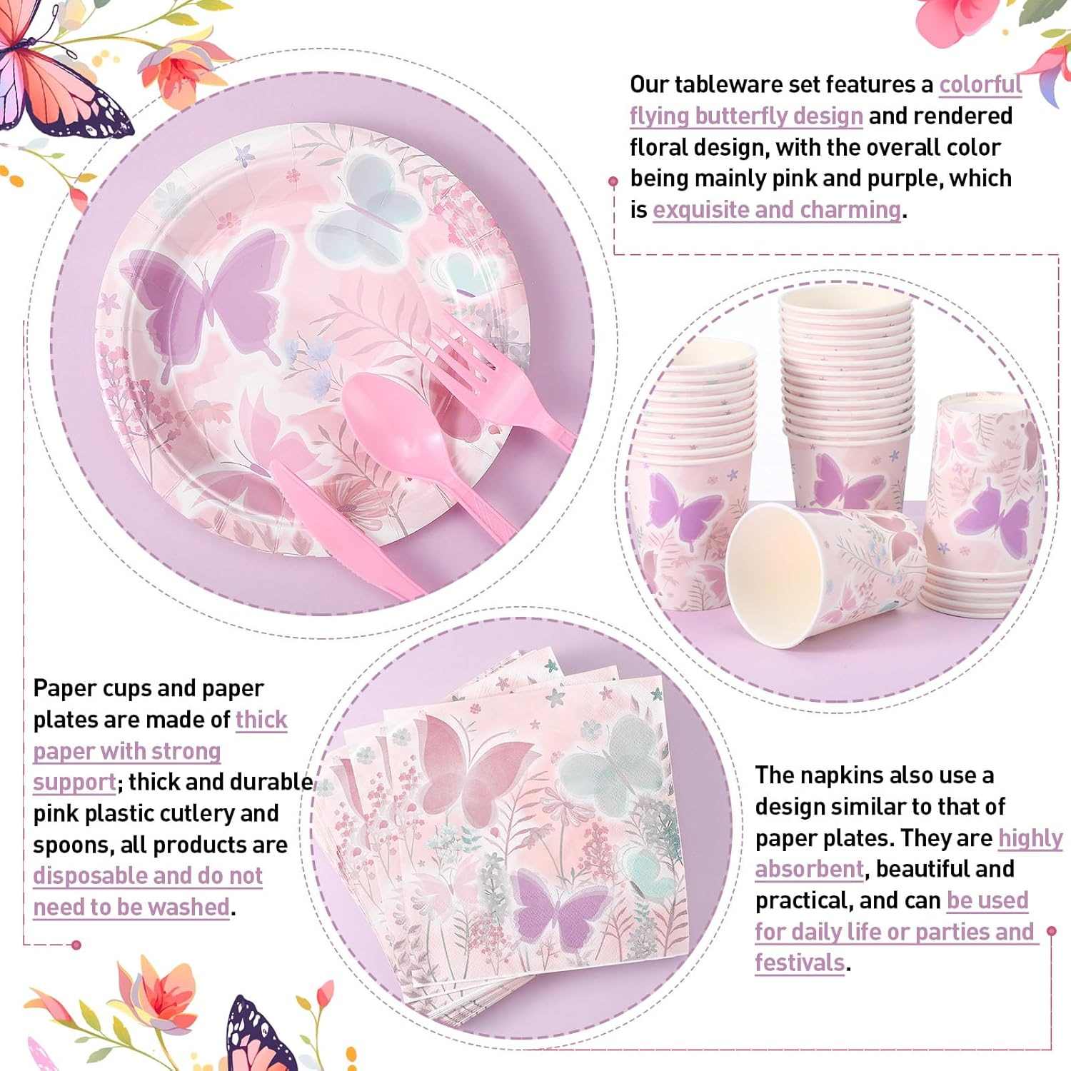 パーティーの装飾に最適なオプションは、バタフライ パーティー食器セットです。ナプキン、紙皿、紙コップ、フォーク、ナイフが含まれます。各作品には蝶の部分が描かれています。