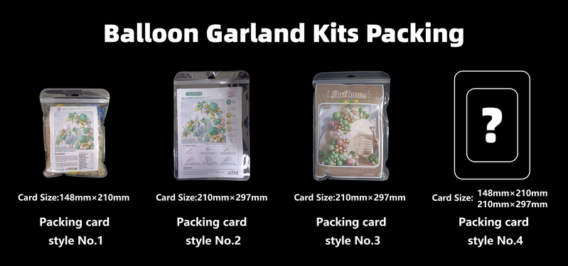バルーンアーチキットの梱包については、販売機会によって異なります。オンラインで販売する場合は、下記の梱包形態 No.1 と真空パックが適しており、配送スペースと配送コストを節約できます。ただし、カスタマイズされたカラフルなバルーン アーチ キットを店頭で販売する場合は、梱包スタイル No. 2 以上の大きな梱包袋が適しています。さまざまなスタイルのカラフルなバルーン アーチ キット カードを備えた大きな梱包袋を使用すると、顧客に商品をよりよく見せることができます。ただし、独自の梱包スタイルをカスタマイズしたい場合も、ご要望をお知らせいただければ、当社のデザイナーが代わりに行います。または、デザインを作成して最終デザインをお送りいただければ、当社の労働者がお客様のご要望に基づいて高品質でカラフルなバルーン アーチ キットの装飾を行います。