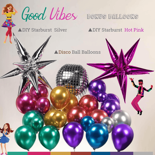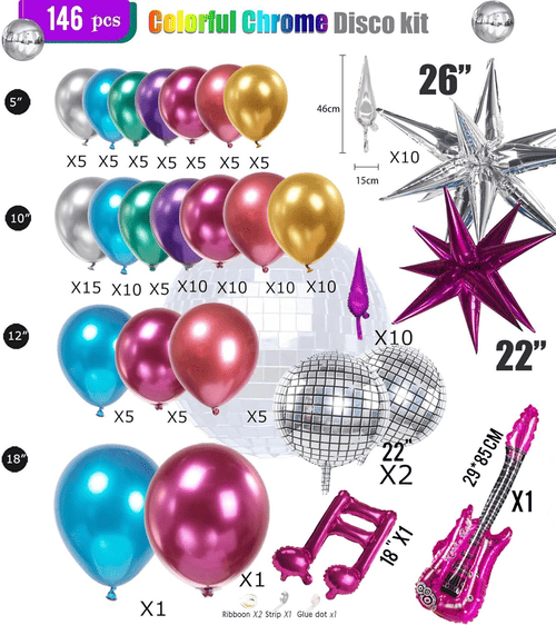 のディスコバルーンアーチキット主にで構成されていますカラフルなラテックス風船 そしていろいろなホイルバルーン。光沢のあるクロームスタイルを作るために、私たちが提供するラテックスバルーンはメタリックラテックスバルーンであり、その表面は非常に美しい金属光沢を持ち、屋内と屋外の両方で優れた結果を達成できます。サイズは5インチ、10インチ、12インチ、18インチです。