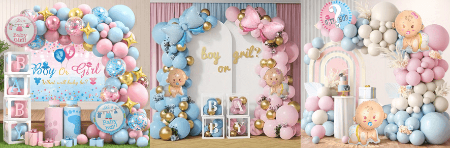 また、主に青とピンクでデザインされた 12 インチのプリント ラテックス バルーンも提供しています。これらをバルーン ブーケ、壁飾り、小さなバルーン チェーンに合わせて、リビング ルームやベッドルームをジェンダー開示のための特別なスペースに変え、儀式の感覚を細部にまで浸透させることができます。