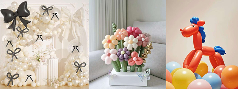 テールバルーンは、そのスタイルを示すために単独で使用できます。テールパーツにより、風船が互いに接続されます。風船の壁、バルーンチェーン、3Dハート、ケーキの構築などを構築できます。形状は複雑になる可能性があります。