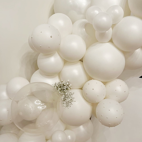 二重層のラテックスバルーンが重なり合って、まるで一連の明るい真珠のように、ブリッジシャワーのガーランドアーチバルーンを形成します。異なるサイズのラテックスバルーンを組み合わせてパッチワークにし、イベント会場全体で最も眩しい存在となります。さらに、二層バルーンは単層バルーンよりも頑丈で耐久性があります。活動現場で多少の衝突や摩擦があっても損傷しにくいため、活動中バルーンアーチ全体が常に完璧な状態を保つことができます。