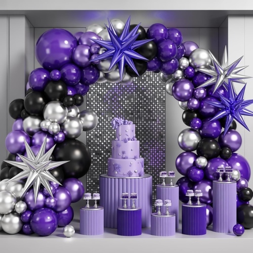 紫と黒のバルーン ガーランド セットは、当社のバルーン ガーランド キットの中で最も人気のあるスタイルの 1 つです。バルーンアーチガーランドには以下が含まれます5インチ、10インチ、18インチのマットパープルバルーン、5インチ、10インチ、18インチのマットブラックバルーン、10インチのメタリックシルバーバルーン、12インチのシルバーの紙吹雪バルーンとドット、バルーンチェーン、リボンなどを接着するバルーンアクセサリー。