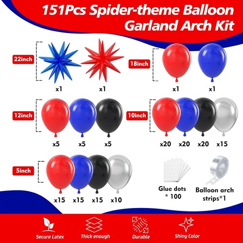 バルーンセットの主な色は青、赤、黒です。特徴的な3色は、映画に登場するスパイダーマンのクールな姿を想像させます。このセットのラテックスバルーンには、マットレッドバルーン、マットブルーバルーン、マットブラックバルーン、メタリックシルバーバルーンが含まれます。このセットのホイルバルーンはエクスプロージョンスターホイルバルーンで、色は青と赤です。