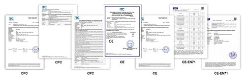 当社の全製品は、CPC、CE、EN71 およびその他の権威ある認証に合格し、ヨーロッパ、アメリカおよびその他の対象市場の安全規制に厳密に準拠しています。これらの資格は、商品がスムーズに税関を通過し、海外市場でのコンプライアンスリスクを完全に回避するのに役立ちます。