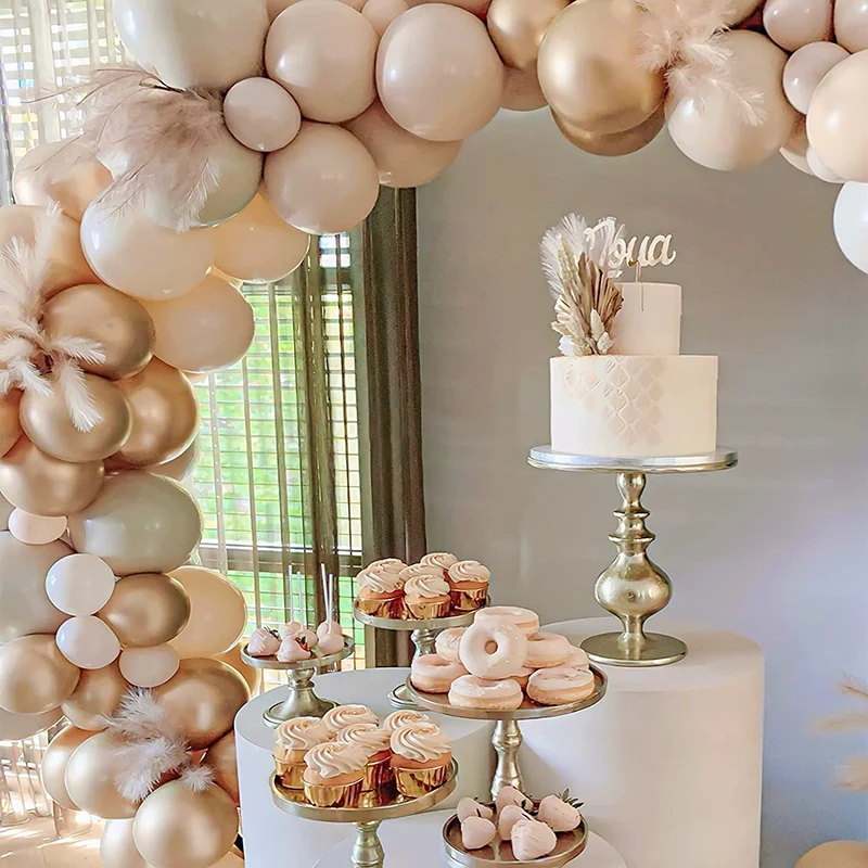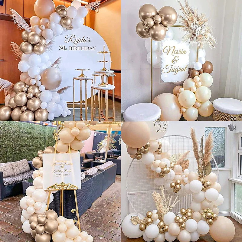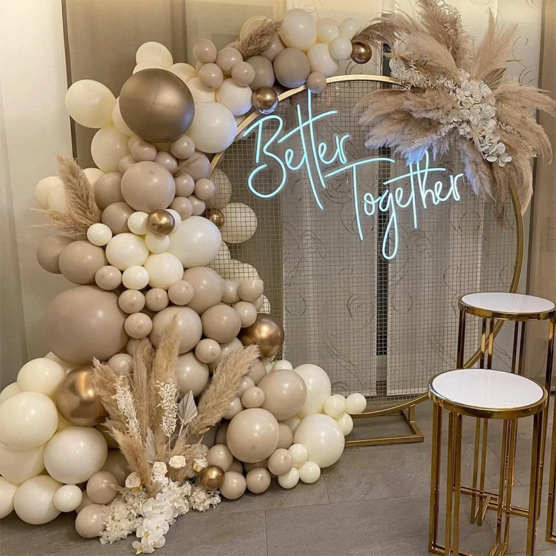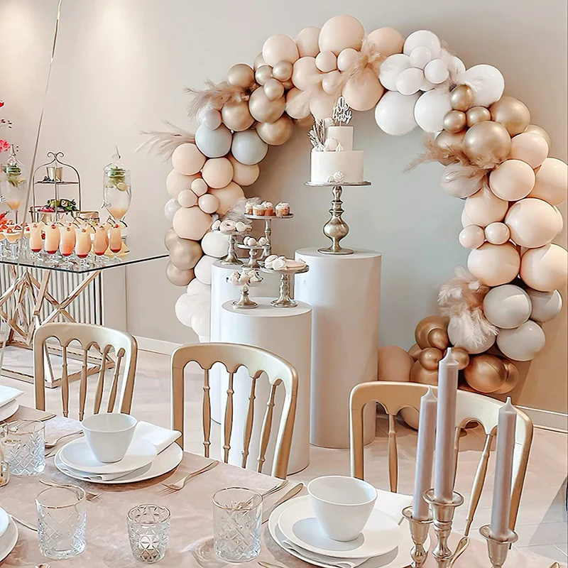 メタリックゴールドバルーンとマットスキンバルーンを組み合わせたこのウェディングバルーンアーチは、現在ヨーロッパとアメリカで最も人気のあるバルーンセットの1つです。デザイナーは、このウェディングバルーンアーチをデザインする際に多くのヨーロッパとアメリカの結婚式とラブストーリーを参考にし、最終的にゴールドとスキントーンを使用して結婚式の壮大さを高め、すべてのゲストがこの結婚式にもっと注目するようにし、同時にマットな白いバルーンを合わせて結婚式の神聖でロマンチックな感覚を高めました。あなたの恋人がゆっくりと手をつないであなたを救い出し、結婚式のバルーンアーチを膝の下に置いてプロポーズしたとき、あなたは幸せの涙を流さないでしょうか?友人や家族が結婚式の写真を撮るとき、結婚式のバルーンアーチはとても美しいでしょう。